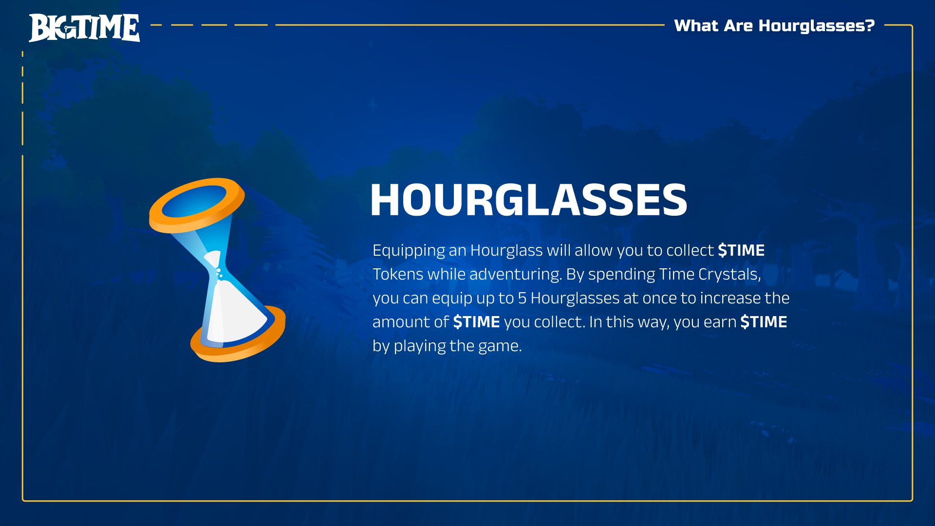 Hourglasses son artefactos de suministro limitado que, cuando se equipan, generan tokens $BIGTIME mientras participas en el juego. Los propietarios de Armerías y Forjas, como artífices del mundo, necesitan tokens $BIGTIME para elaborar sus propios Coleccionables Cosméticos. Cada artículo creado es genuinamente único y, una vez terminado, se ofrece en el Marketplace de Big Time para que otros jugadores lo adquieran.