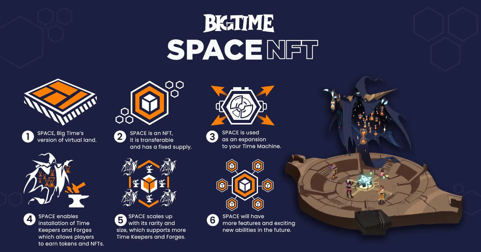 Desde la creación de armas hasta la personalización de prendas de vestir, el juego ofrece la oportunidad de que cada jugador dé rienda suelta a su creatividad y haga suyo su mundo digital. Este sistema garantiza que todos los jugadores tengan acceso a las mismas recompensas y oportunidades, sin importar su trasfondo. Todo comienza con SPACE, la tierra digital de Big Time, que incluye NFT de utilidad: fábricas que posibilitan la elaboración y venta de Coleccionables Cosméticos y Hourglasses.